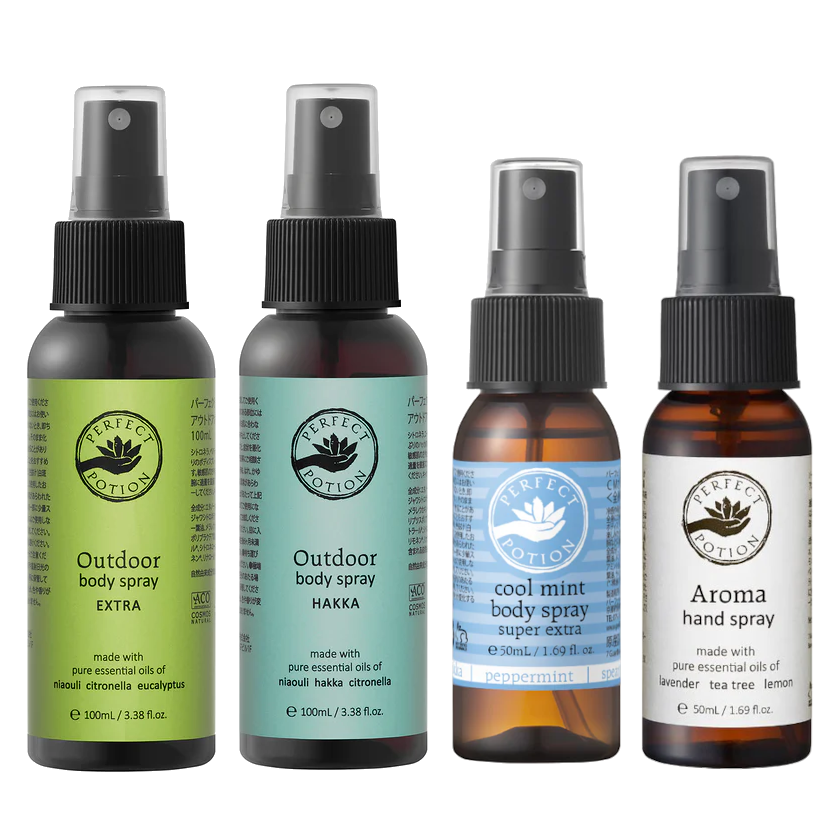 2025年リニューアルのアウトドアボディスプレー2種と、ミニサイズのクールミントボディスプレー、手指をすっきりクリアにするアロマハンドスプレーのブラックフライデー限定セットです。