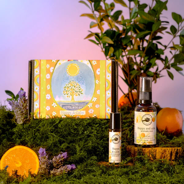 幸せで穏やかな気持ちになるような、オレンジやラベンダーのハッピー&カームブレンドの香りのギフトです。